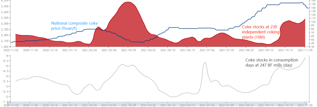 By November 4, coke stocks at China’s 247 blast-furnace steel plants under Mysteel’s weekly survey added up to 7.2 million tonnes, or a low since early September, while the consumption days at 15.8 days on average was a high since early April 2020 due to their lower daily consumption
