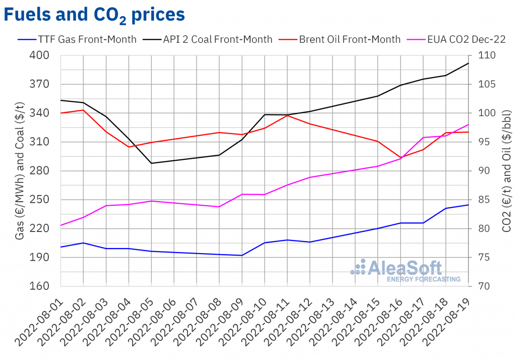 Gas and CO2 prices increased during the third week of August and each one registered a new historical maximum on the 19th. This caused an increase in prices of around 30% in most European electricity markets including France, Germany, and Belgium..