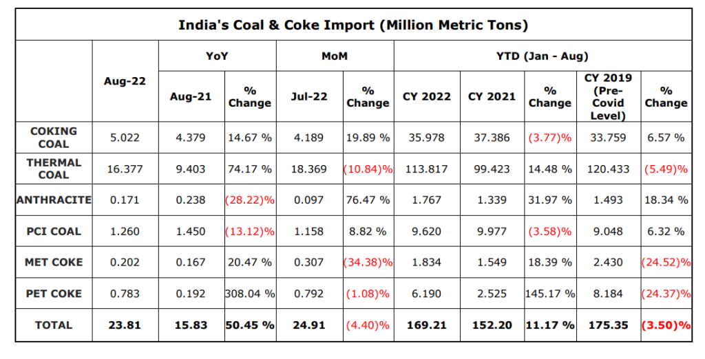 India’s total coal & coke imports touched the 23.81MMT mark from 15.83MMT last year. The total imports reduce to 4% monthly and rise to 50% yearly.