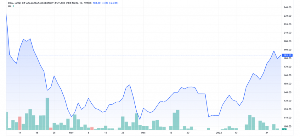 API2 prices continue to climb and Feb 2022 contract reached to $ 183.50 on Friday closing up by $ 10 WoW basis. API2 prices reaches 14 weeks high on 26th Jan at $ 189. Feb 2022 contract has touched above $ 233 on 5th Oct 2021 and low at $ 108 on 30th Nov 2021.