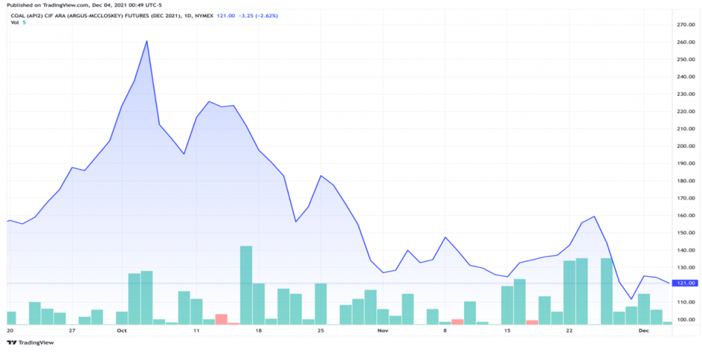 International coal prices were stable during the week. There was good hope on starting of week but sceptical on Omicron, Coal remain range bound. During last week API2 contract gained a little after big fall. Dec 2021 contract were closed at 121 down by 23 USD compare to last week.